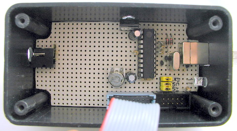 Vue interne de la réalisation. Le connecteur pour l'alimentation extérieure est inutilisé. La led, (en bas à droite) clignote lors de la réception d'une trame RC5 par le capteur infrarouge (en haut). Le connecteur à 10 broches sert à connecter le programmateur AVR.