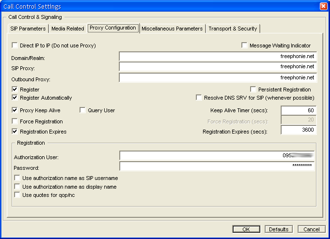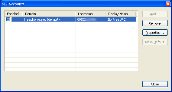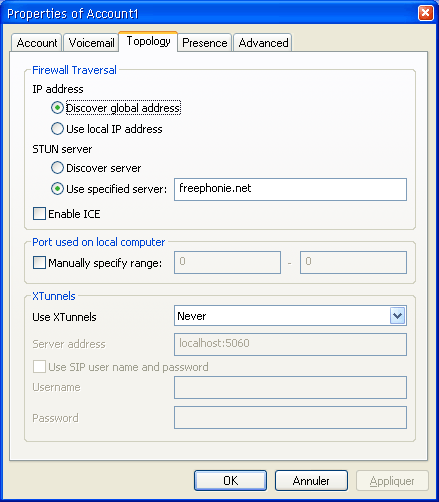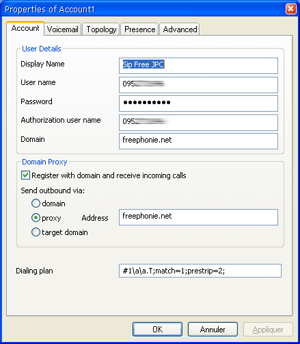Après validation, le logiciel vous demande les logins et mots de passe de votre compte SIP. Le mot de passe est celui que vous avez choisi dans votre compte FREE (rubrique 'mon compte' sur http://www.free.fr, option téléphonie SIP).
