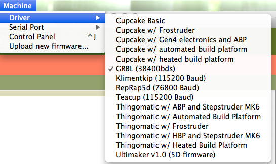 Nous allons ensuite sélectionner le pilote que nous venons tout juste d'installer. Pour ce faire, aller dans le menu "Machine", puis "Driver", et sélectionner "Grbl 38400 bauds" :