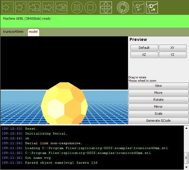 Une autre méthode de test est d'utiliser ReplicatorG, le logiciel conçu pour piloter les imprimantes 3D Makerbot. Écrit en Java, et basé sur le code de l'environnement de l'Arduino, ce programme a le bon gout de fonctionner aussi bien sur Windows, Linux et OSX.