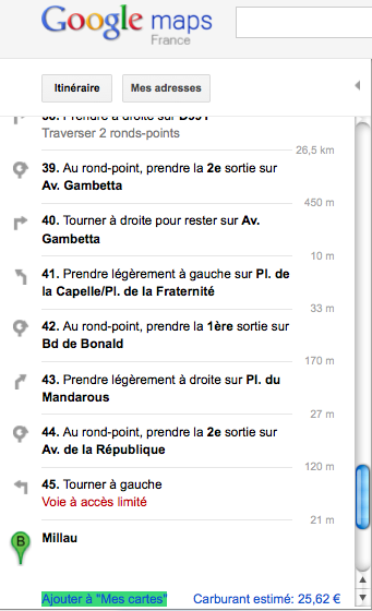 - Dans Google Maps, dans l'onglet itinéraire, aller en bas de la liste des étapes et cliquer sur le bouton "Ajouter à mes cartes"