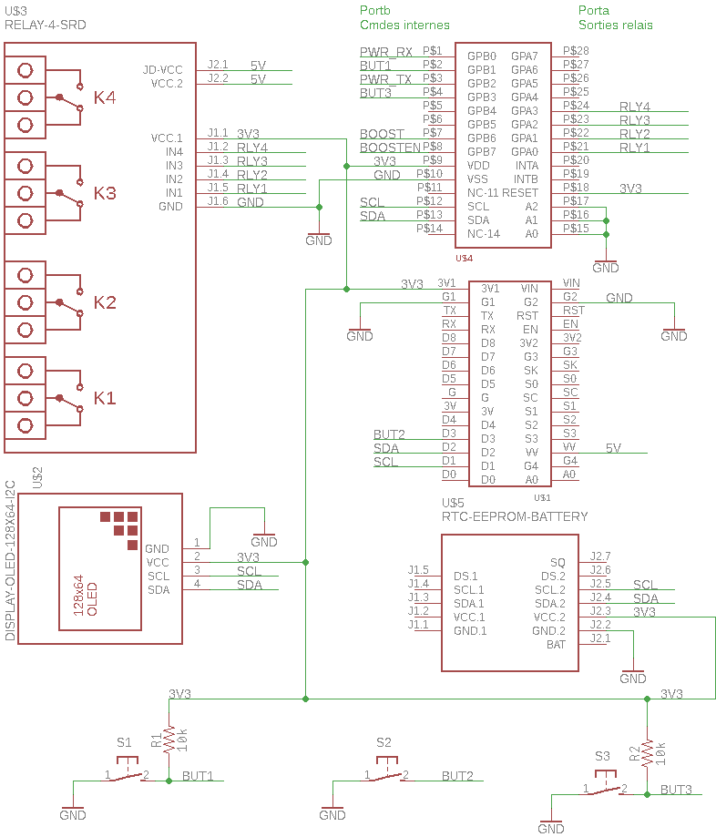 Mais comme l'ESP ne contient pas assez d'entrées sorties, l'I2C est utilisé à haute dose pour en ajouter, supporter l'afficheur et l'horloge temps réel. Les périphériques suivants sont supportés dans le code :