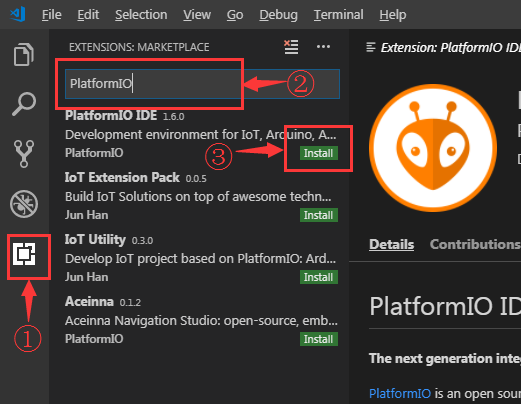 - Ouvrir VisualStudio Code, cliquer sur extensions (1), Recherche PlatformIO (2) et cliquer sur Installer (3)